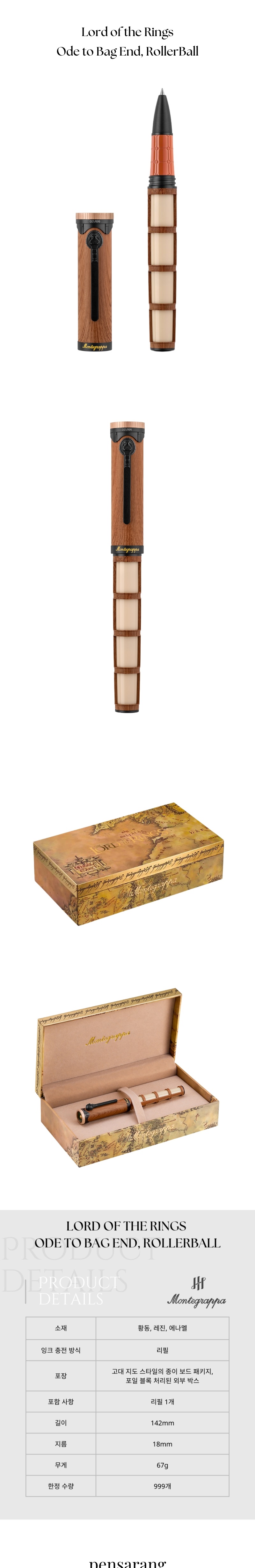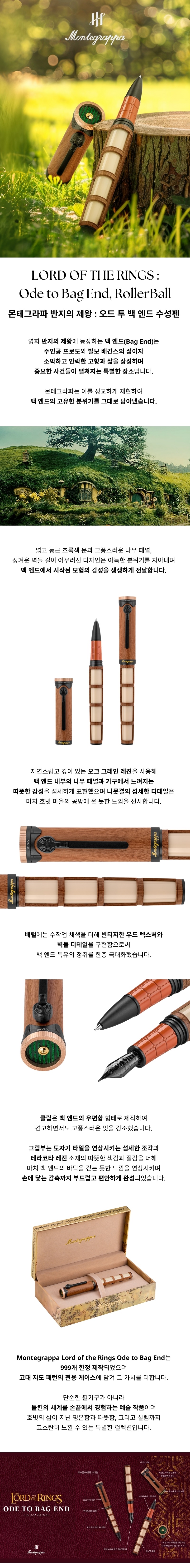 중간계로의 귀환은 그 중심부에 자리한 전원적인 땅, 호빗톤의 따뜻한 정서로 우리를 이끕니다. 백 엔드(Bag End)의 굴 형태로 이어진 집 안에는 안락함과 행복이 가득하며, 배긴스 가문의 언덕 위 집은 영화 역사상 가장 장대한 이야기 중 하나가 시작된 무대이기도 합니다. 이 컬렉터스 에디션은 그 공간이 지닌 분위기와 상징성을 담아, 필기하는 이들로 하여금 각자의 마법 같은 여정을 떠나게 합니다. 총 999본 한정 생산.