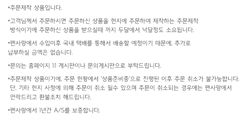 ▫︎ 주문이 ‘상품준비중’ 상태로 전환된 이후에는 해외 본사 오더가 확정된 단계이므로 주문 변경 및 취소가 불가합니다. 단, 브랜드 사정에 따른 부득이한 사유로 주문이 불가한 경우, 펜사랑에서 고객님께 별도 안내 후 결제 금액 전액을 환불해드립니다.