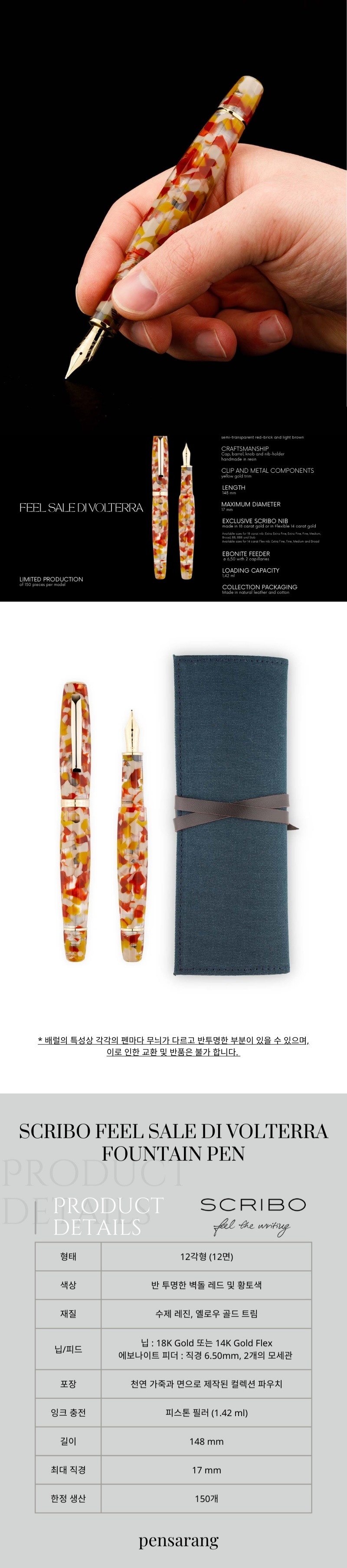 수작업으로 제작되는 필기구의 특성상, 각 펜마다 고유한 패턴과 무늬를 지니고 있습니다. 같은 제품이라도 배럴의 무늬, 패턴, 질감, 칠 등의 표현이 일정하지 않을 수 있으며 상품 페이지의 이미지와 다소 상이할 수 있습니다. 이는 수작업으로 제작된 제품의 자연스러운 특성으로 제품 하자의 사유로 간주되지 않습니다.