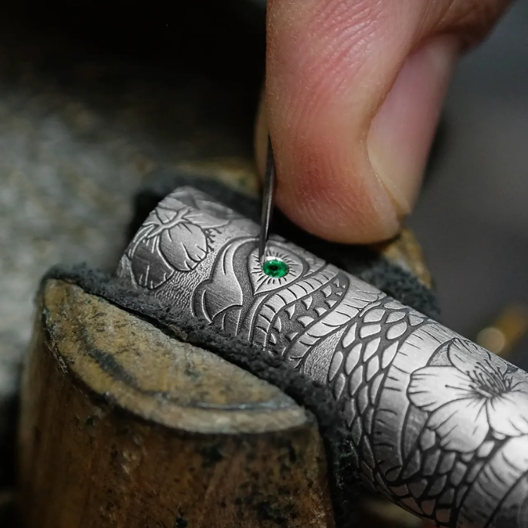 탁월한 장인 정신과 동양 철학이 만나 '변화는 믿음에서 시작된다'는 메시지를 물리적 형태로 담아냅니다. 바디 전체를 채운 실버 인그레이빙에는 신화·문학·예술 속에서 깊이 자리해온 복합적 존재, ‘뱀’이 지닌 지혜와 카리스마가 오롯이 새겨져 있습니다. 변화의 상징인 뱀의 이미지는 다양한 식물 모티프, 세공된 에메랄드, 그리고 생명력을 품은 바이오필릭 레진을 통해 표현됩니다. 고도의 멀티-액시스 가공 기술은 바디 곳곳의 복잡한 곡선과 회전을 정교하게 구현하며, 사틴 브러싱과 자연스러운 산화 처리로 마감된 표면은 각 작품의 깊이 있는 파티나와 카리스마를 한층 더 끌어올립니다.