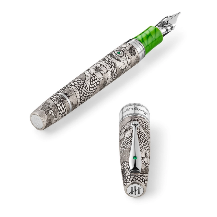 뱀이 탈피를 통해 새로운 생을 맞이하듯, 이는 개인의 성장과 재탄생에 대한 은유입니다. 에메랄드 장식과 ‘그린 맘바’ Juma® 레진의 비늘 같은 구조는 새로운 시작의 이미지를 강화합니다. 바디 전체를 감싸는 ‘Infinity’ 인그레이빙은 선과 면을 넘나드는 촘촘한 밀도 변화로 뱀이라는 존재의 복잡한 성질을 정교하게 드러냅니다. 지성, 신비로움, 생존 본능, 그리고 약간의 위험한 매력이 조화롭게 어우러집니다. 행운의 숫자 2, 8, 9를 반영해 제작된 이번 에디션은 전 세계 289점 한정 생산되며, 정밀한 피스톤 필링 시스템과 맞춤형 18K 골드 ‘Crazy Eye’ 닙이 장착됩니다.