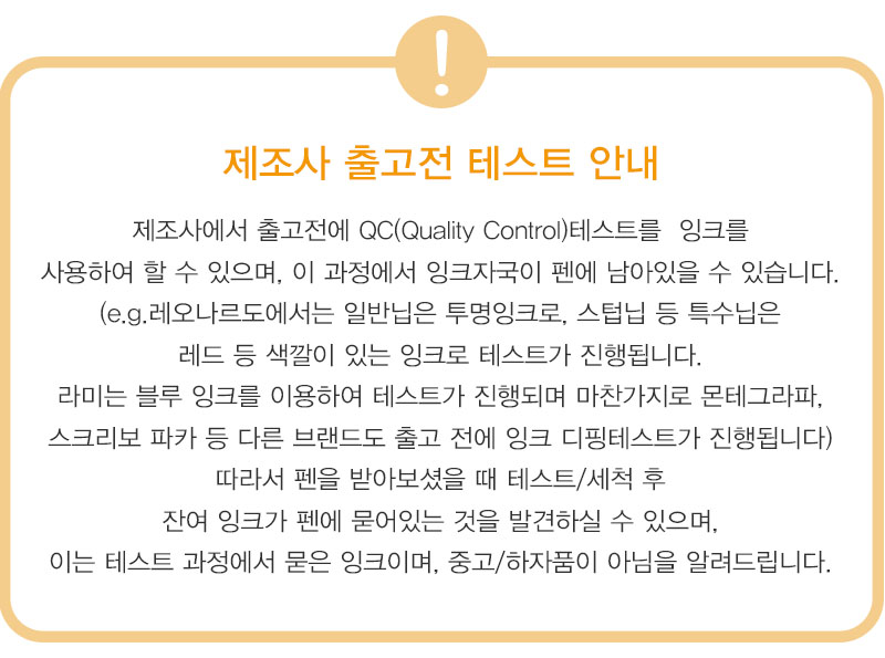 제조사는 출고 전 품질 검수(QC) 과정에서 펜촉의 잉크 흐름 테스트를 진행합니다. 이로 인해 펜촉 주변에 미세한 잉크 자국이 남아 있을 수 있습니다. (대표적인 예: 몬테그라파, 레오나르도, 스크리보, 라미, 파카 등)