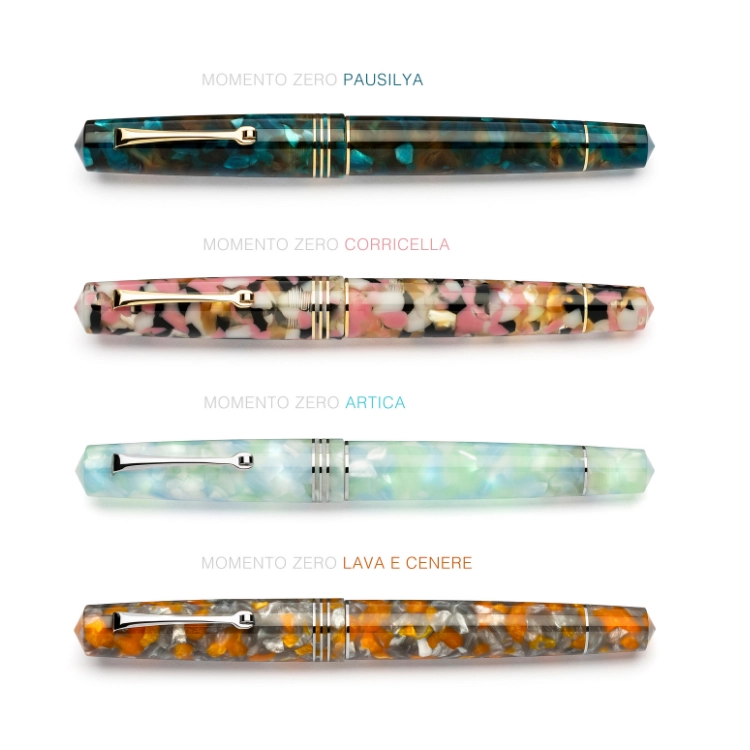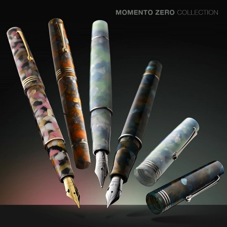 레오나르도 오피치나 이탈리아나에서 새로운 소재의 모멘토 제로 컬렉션을 선보입니다. 수년간 전 세계 수집가와 필기구 애호가들 사이에서 아이콘으로 자리 잡아온 레오나르도 모멘토 제로 시리즈는 1930년대 클래식 만년필 디자인을 바탕으로 2017년에 설계되었으며, 캡의 3중 링, 루졸리나(ruzzolina) 클립, 양쪽 끝의 콘 형태가 특징입니다.