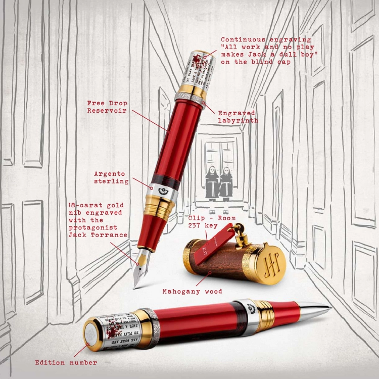 배럴은 엘리베이터 문처럼 열리는 구조로 설계되어, 열리는 순간 Free Drop Reservoir 시스템이 드러나며 영화 속 가장 인상적인 장면 중 하나를 떠올리게 하며 이 에디션의 기술적 완성도를 보여줍니다. 18K 골드 닙에는 주인공 잭 토런스가 새겨져 있으며, 그가 집으로 돌아오는 장면을 상징합니다. 블라인드 캡에는 “All work and no play makes Jack a dull boy” 문장이 연속 각인되어 이성이 무너지는 순간을 상징적으로 표현합니다.