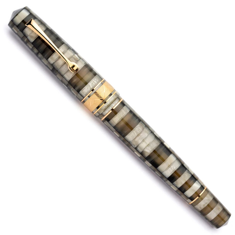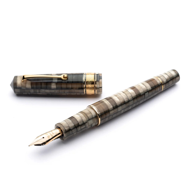 이탈리아에서 제작된 스파게티 레진 슬랩을 가로 방향으로 커팅해 실제 모자이크처럼 살아 있는 텍스처를 완성했습니다. 측면에는 각진 구조의 패턴을, 전면과 후면에는 ‘링드 아르코(ringed Arco)’ 를 연상시키는 독특한 패턴이 나타납니다. 약 2년간의 실험 끝에 탄생한 이 구조는 빛과 각도에 따라 다채로운 표정을 보여주며, 이탈리아에서 제작된 제품으로 개별 넘버링이 적용됩니다. 팔라듐 또는 골드 마감의 입체적인 팬터그래프 장식 메탈 파츠가 적용되었습니다. 대용량 피스톤 필링 시스템을 채택해 풍부한 잉크 용량을 제공하며, 전용 렌치를 통해 분해가 가능합니다. 골드 닙에는 블랙 에보나이트 피드가, 스틸 닙에는 ABS 피드가 조합되며, 제품 구성에는 잉크 병 1개가 포함되어 있습니다. 제품 구성에는 잉크 병 1개가 포함되어 있습니다.