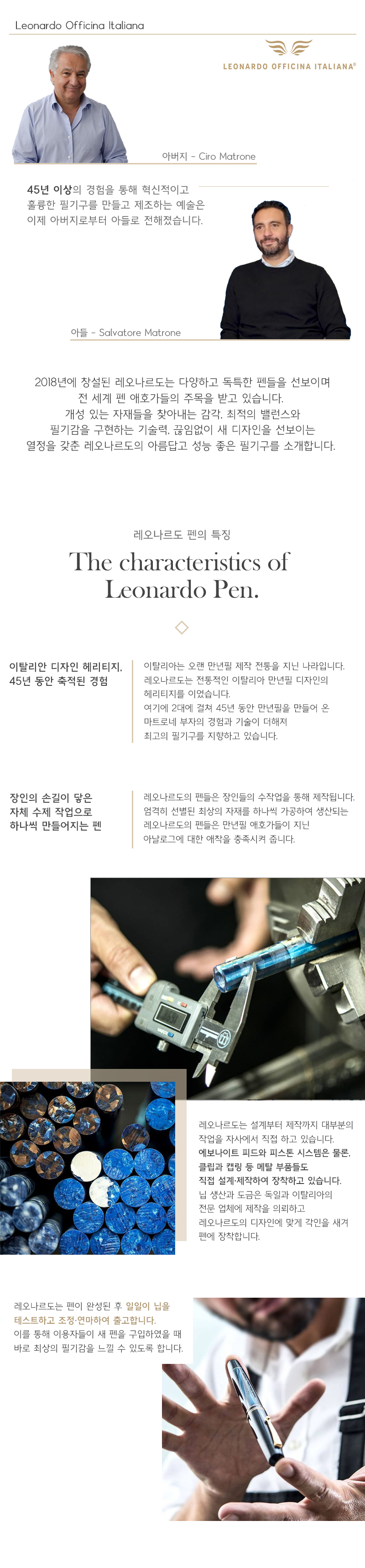 수작업으로 제작되는 필기구의 특성상, 각 펜마다 고유한 패턴과 무늬를 지니고 있습니다. 같은 제품이라도 배럴의 패턴, 질감, 칠 등의 표현이 일정하지 않을 수 있으며 상품 페이지의 이미지와 다소 상이할 수 있습니다. 이는 수작업으로 제작된 제품의 자연스러운 특성으로 제품 하자의 사유로 간주되지 않습니다.