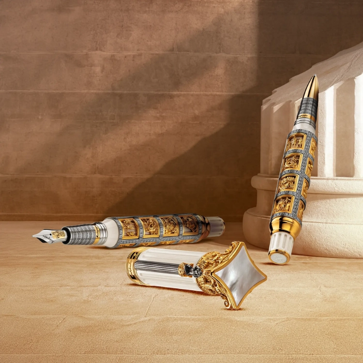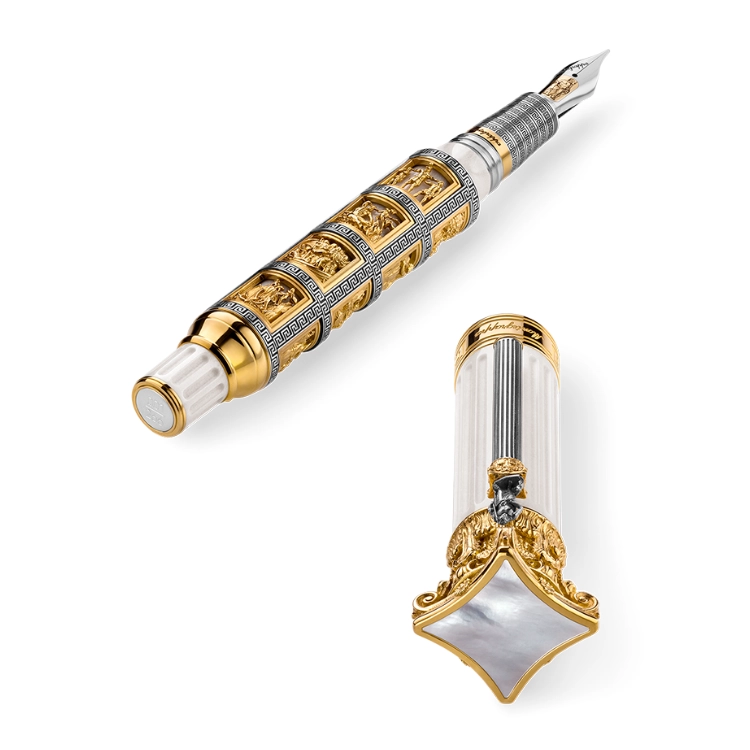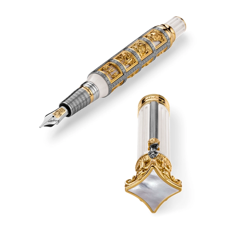 트로이 전쟁에서 귀향하는 동안 오디세우스가 겪는 위험한 순간들이 버메일(vermeil)과 그리스식 기하학 문양으로 둘러싸인 장면으로 표현됩니다. 섬세한 모자이크 프리즈는 서양 문명사에서 가장 극적이고 강렬한 이야기 중 하나를 생생하게 되살립니다. 또한 그리스 건축 양식 중 가장 화려한 코린트식 요소들은 미니어처 및 마이크로 조각 기술로 구현되어, 아칸서스 잎과 볼루트 장식이 놀라운 디테일로 생동감 있게 되살아납니다.
