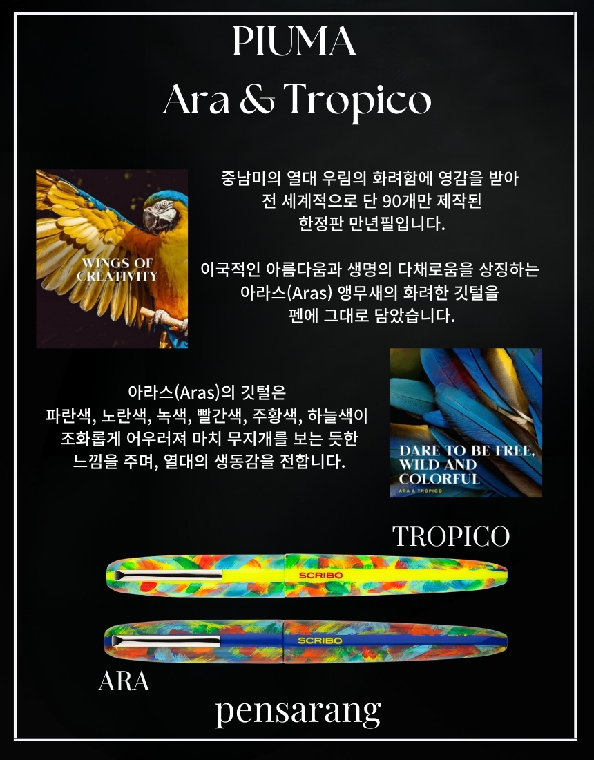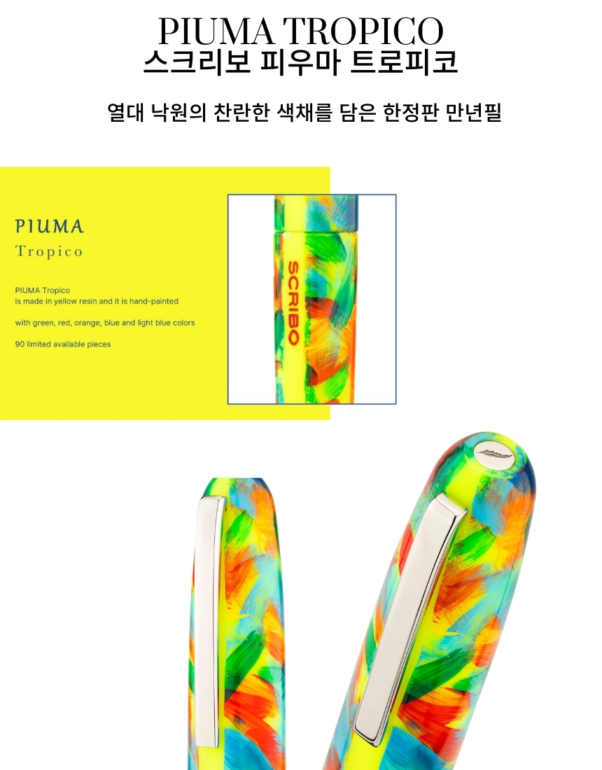 PIUMA Tropico는 열대 조류의 화려한 깃털에서 영감을 받아 탄생한 에디션으로, 브러시와 에어브러시를 활용한 수작업 컬러 레이어링이 특징입니다. 불꽃 같은 레드부터 선명한 블루와 그린까지, 하나의 펜에 무지개처럼 펼쳐지는 색채는 즉흥성과 자유로운 필기 감성을 담아냅니다. 특수 UV 차단 래커 마감으로 시간이 지나도 생생한 색감을 유지하며, 전 세계 219피스 한정 생산됩니다.